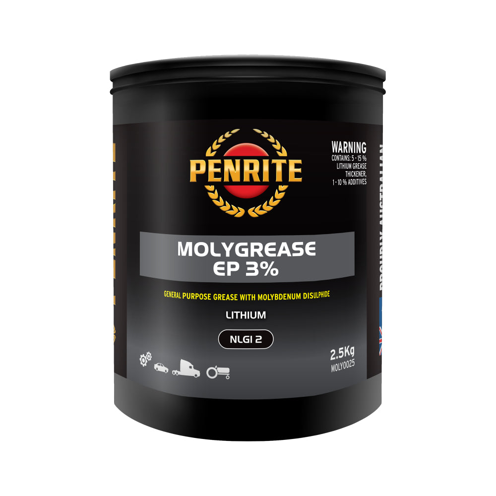 Molygrease EP 3% is an all purpose, NLGI 2, high temperature grease. It features a lithium soap base with premium quality base oils and molybdenum disulphide (moly) for added protection.
