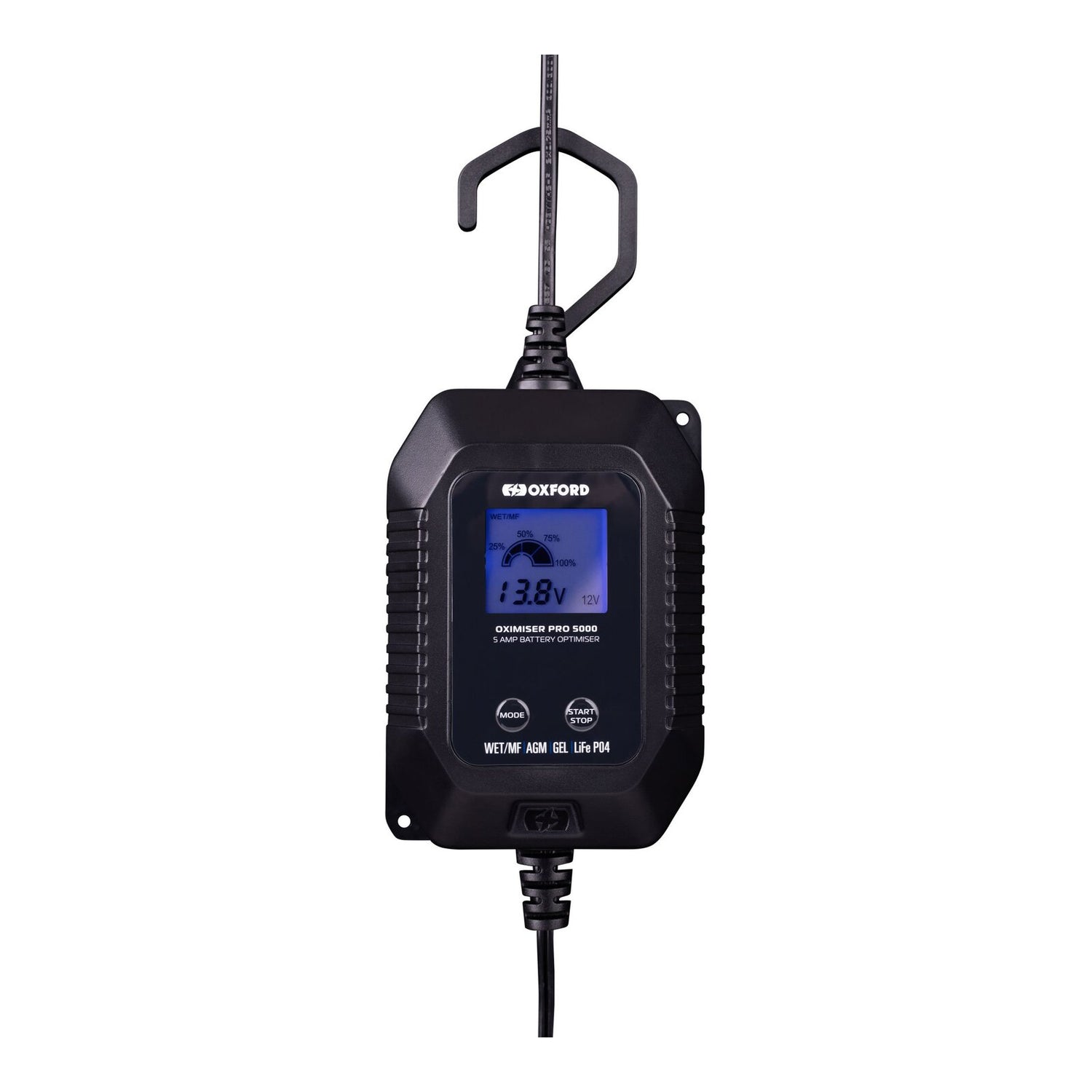 Suitable for use in any environment, the Oximiser Pro's high-impact, fire- resistant ABS casing is ultrasonically sealed to achieve an IP65 rating. The clear, easy-to-read LCD display assists the user throughout the charging stages and if required, the charger can be lifted off the ground by clipping on a removable hanger.